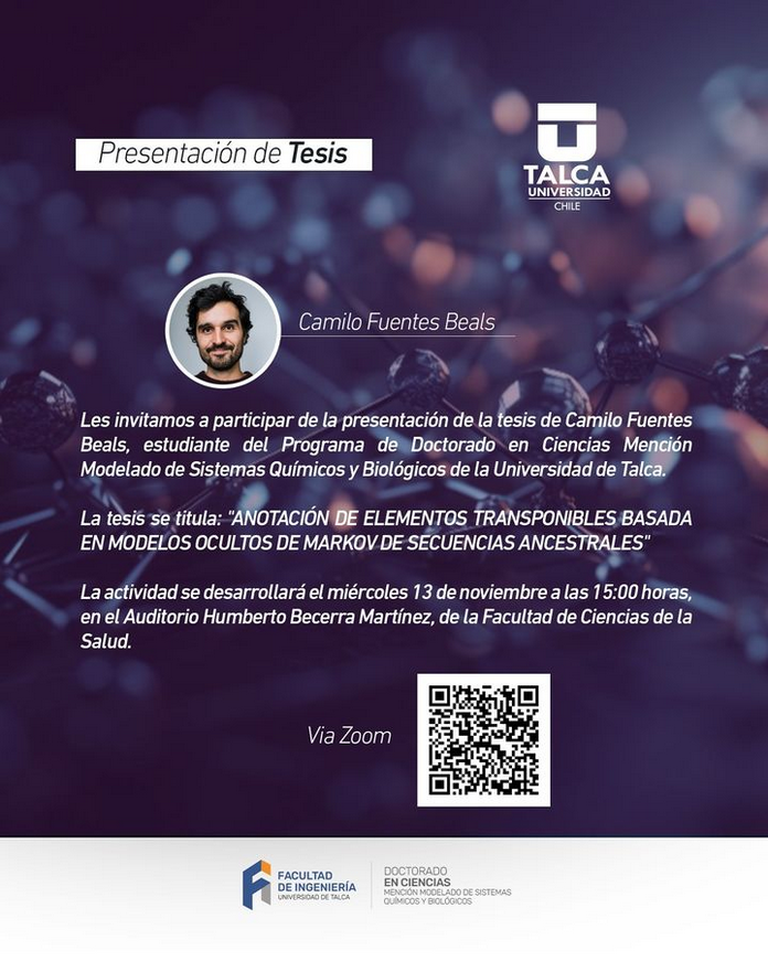 Les invitamos a participar de la #PresentaciónDeTesis de #CamiloFuentesBeals, estudiante del Programa de Doctorado en Ciencias Mención Modelado de Sistemas Químicos y Biológicos de la Universidad de Talca.