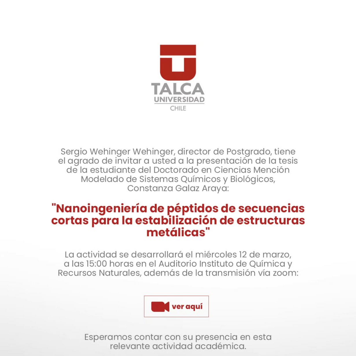 Les invitamos a participar de la #PresentaciónDeTesis de #ConstanzaGalazAraya, estudiante del Programa de Doctorado en Ciencias Mención Modelado de Sistemas Químicos y Biológicos de la Universidad de Talca. La tesis se titula: “Nanoingeniería de péptidos de secuencias cortas para la estabilización de estructuras metálicas".